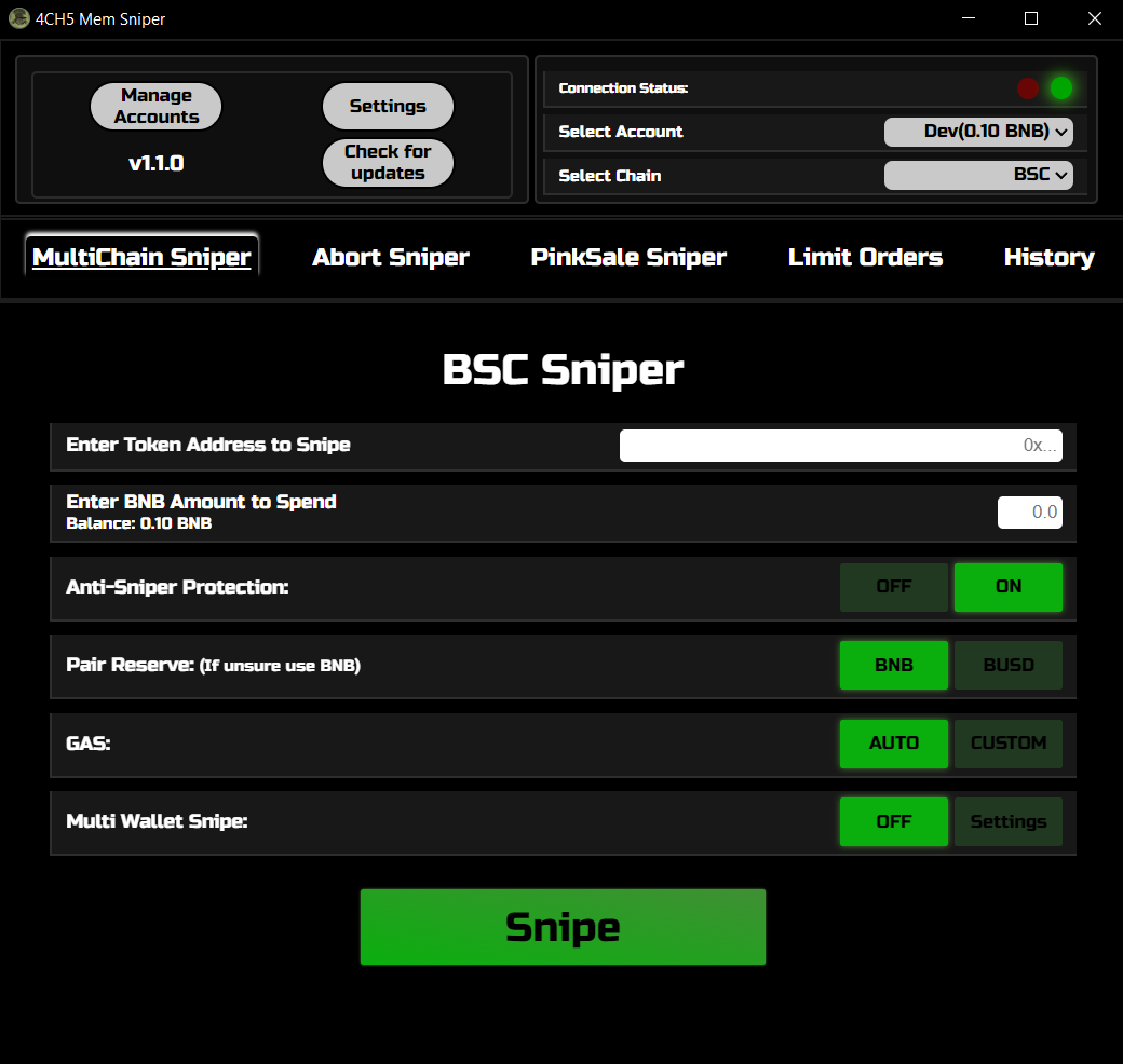 The Mem Sniper is a downloadable version of the coin sniper that lets you snipe directly with your private key to allow you to bypass confirmation windows and buy tokens even faster.